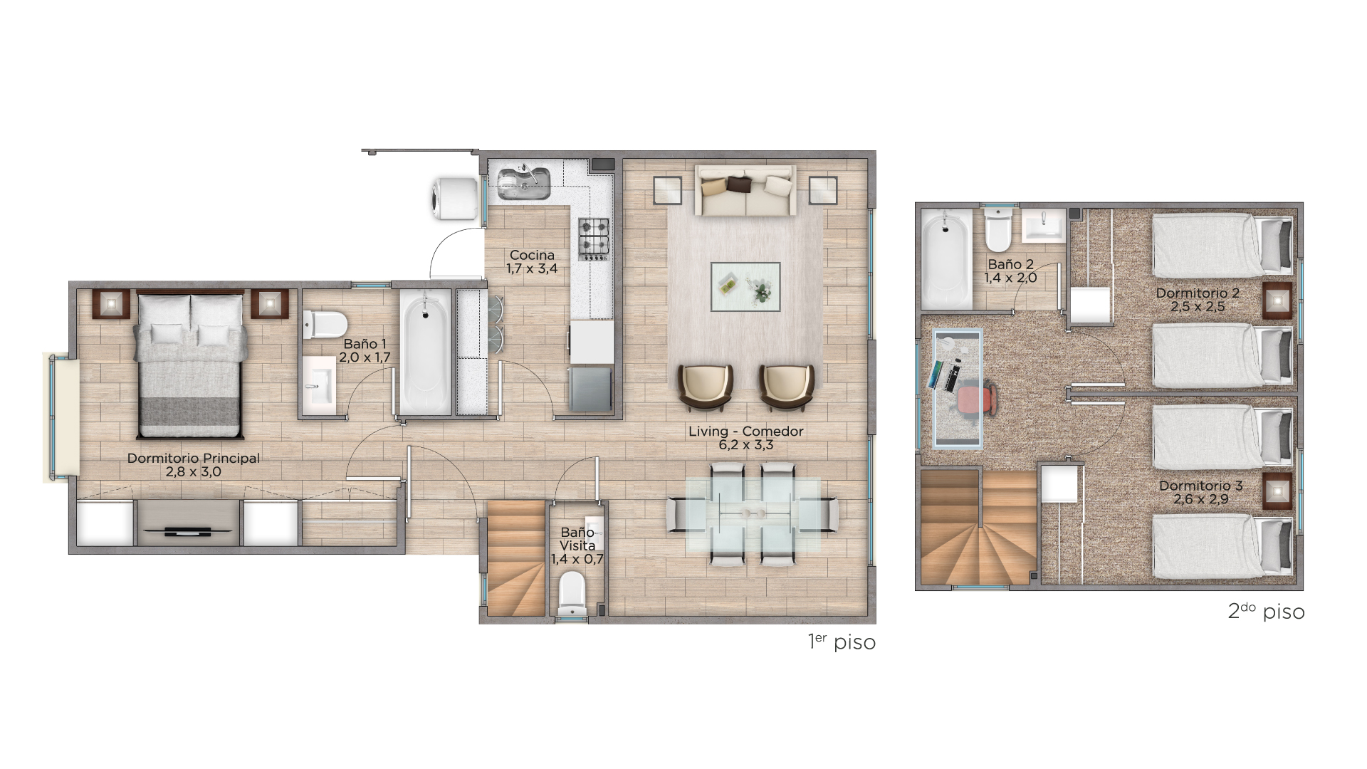 • Modelo de casa aisladas de dos pisos de 3 dormitorios con 3 baños de 86 m2, con espacios bien distribuidos