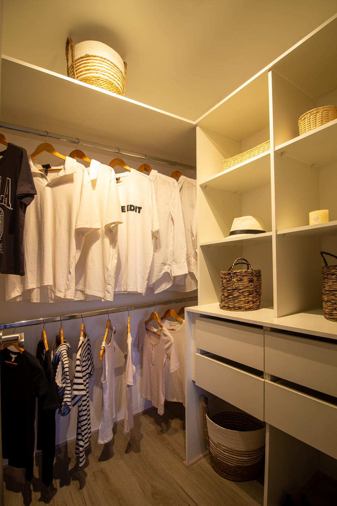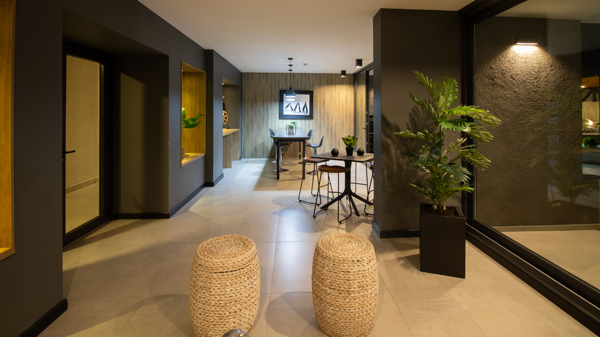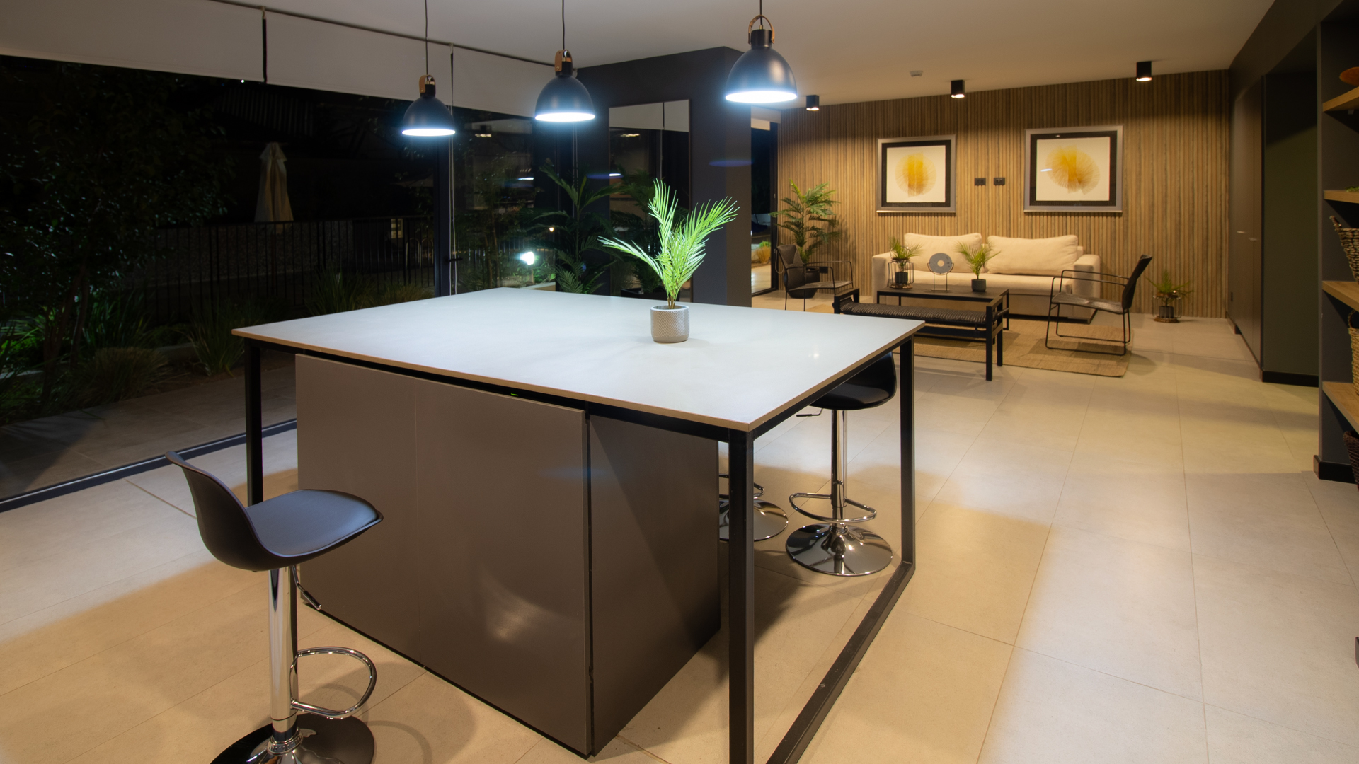 - Cocina integrada con cubiertas de cuarzo y muebles con cajones cierres suave, equipada con encimera eléctrica vitrocerámica, campana, horno eléctrico y microondas empotrados, lavaplatos bajo cubierta Teka®.