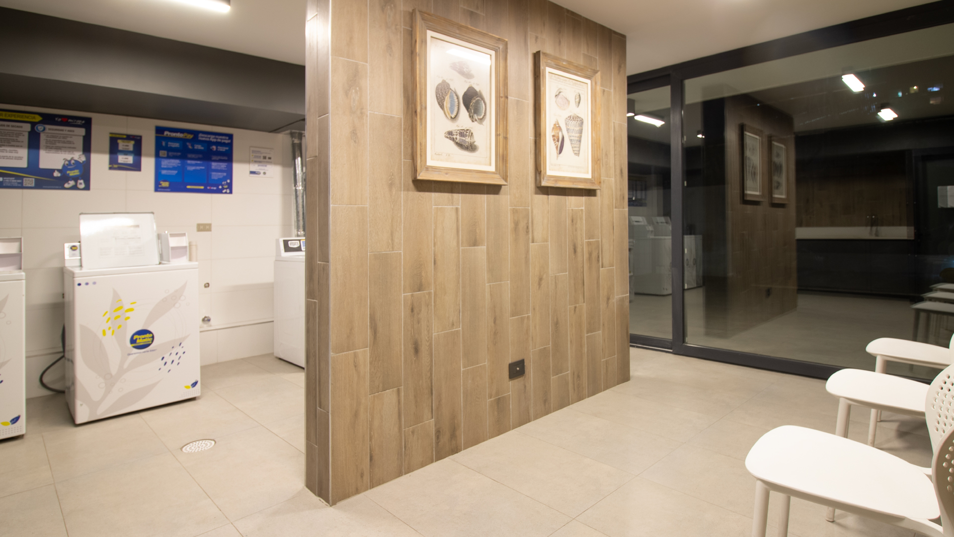 • Puerta de acceso enchapada en madera, espacio para lavadora.